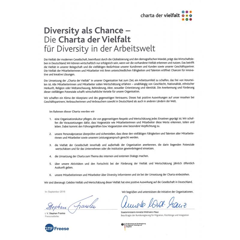 Freese unterstreicht mit der Unterzeichnung die bereits lange gelebte Firmenkultur von Wertschätzung und respektvollem Miteinander sowie überprüfbaren Personalprozessen. Die mit der Charta einhergehende Selbstverpflichtung zum Diversity Management ist bewusst in die Personalstrategie und die Organisationsentwicklung integriert.